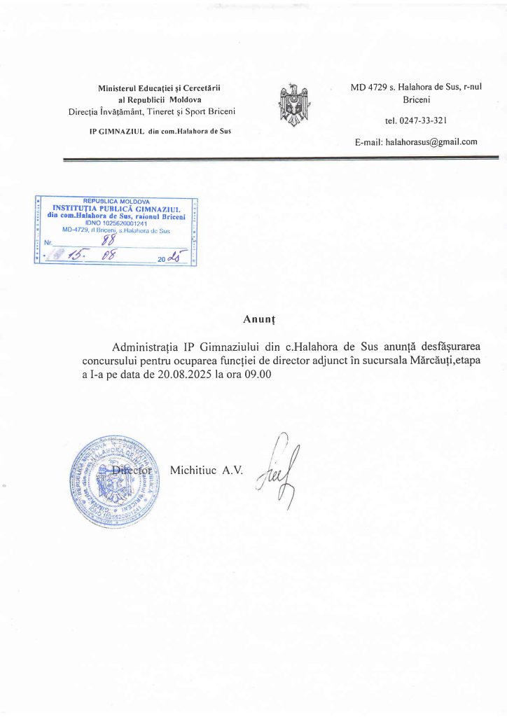 Anunț: Desfășurarea concursului, etapa a I-a, funcția de director adjunct sucursala Mărcăuți